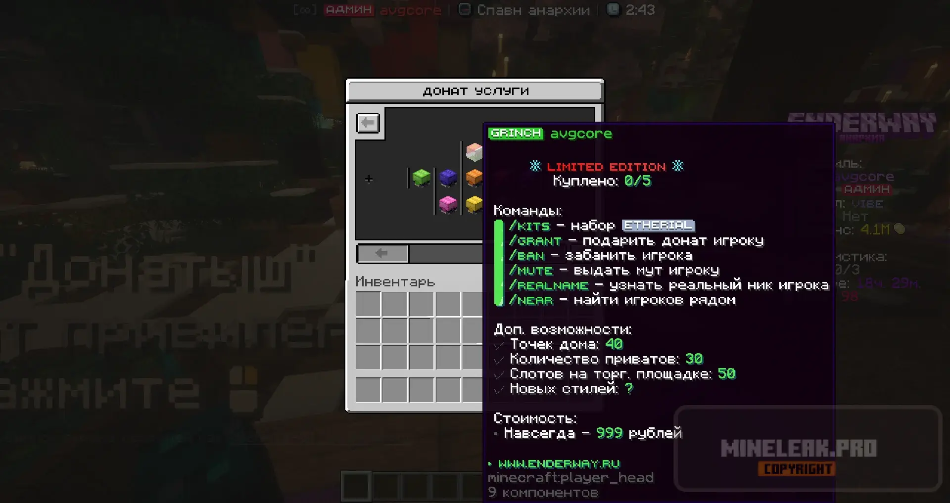донат-привилегий, две админ-привилегии, медиа, ежедневные награды, продвинутая
