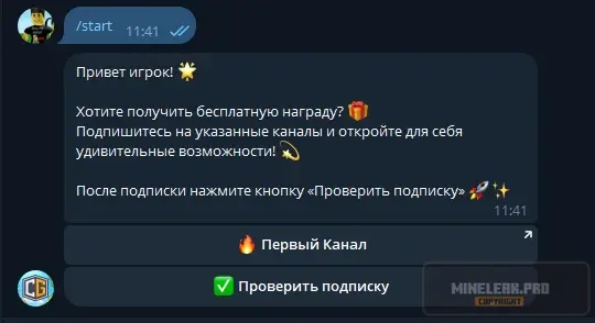 Приветствую вас! Все же вы хотели и видели, как сделать такие награды на других серверах. Я создал этот плагин именно для вас. Теперь игроки смогут получить свои награды за подписку на Telegram-канал. Награды можно менять в конфиге, также как и тексты, токен бота, ID канала и ссылку. Можно добавить сколько угодно Telegram-каналов главное, чтобы игрок был на них подписан. Чтобы бот работал, его нужно добавить на свой Telegram-канал и выдать ему права администратора. Чтобы получить награду, нужно прописать /free или /start. Легко и просто.